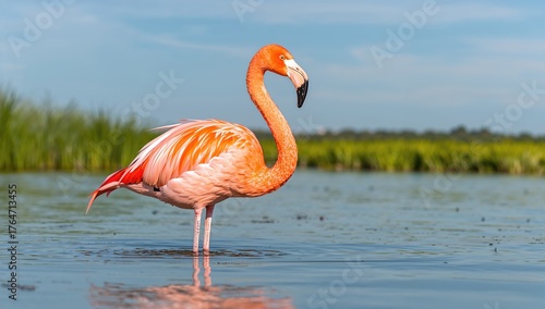 © AIArtistry, Obraz premium Lesser flamingo (Phoeniconaias minor) wading in water during mating season in a wetland habitat