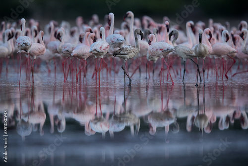 © Dr Ajay Kumar Singh, Naklejka premium Lesser Flamingos at Lake Bogoria with dramatic reflection, Kenya