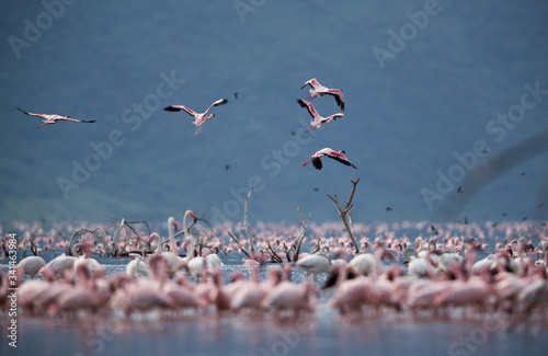 Fototapeta premium Lesser Flamingos flying at Bagoria Lake
