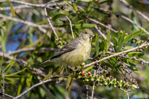 © John, Fototapeta premium Lesser goldfinch in the trees and feeder