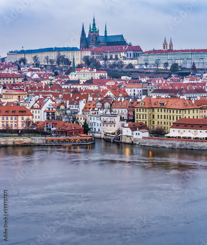 Fototapeta premium Lesser Town and the catle on Vltava river at dusk, Prague, Czech Republic