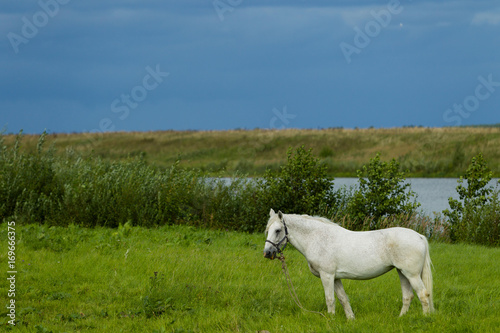 Fototapeta premium Letni krajobraz z białym koniem na wypasie