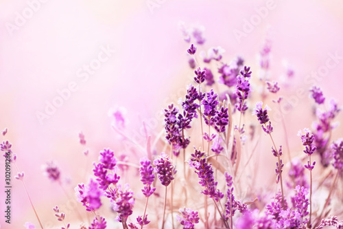 Naklejka premium Letnie kwitnące kwiaty lawendy, selektywna ostrość, płytkie DOF, stonowane, lekkie tło bokeh, pastelowa i miękka karta kwiatowy