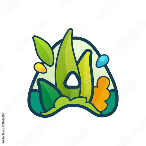 © kaer_fstock, Naklejka premium Letter A eco logo with green leaves and dew drops.