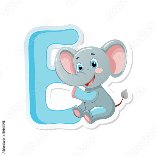 © Olga, Fototapeta premium Letter E with cute baby elephant sitting