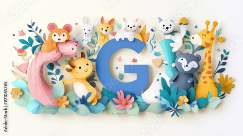 © Ecleposs, Obraz premium Letter G: Paper cut style illustration, colorful 3D whimsical, text "G" made of cute animals