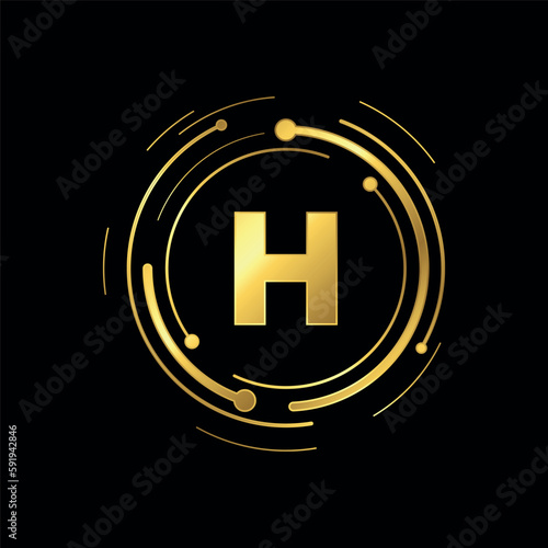© waniperih, Fototapeta premium Letter H Initial Gold Color Cyber Multimedia Logo