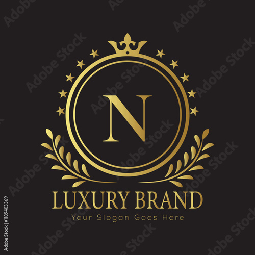 © ASRAF ALI, Fototapeta premium Letter Luxury brand logo design with a royal gold crown emblem and elegant typography