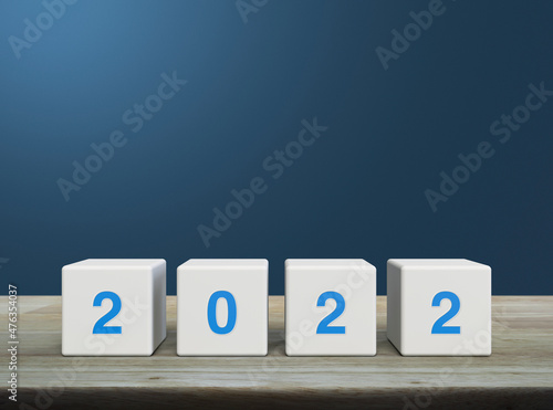 Obraz premium 2022 letter on white block cubes on wooden table over light blue gradient...