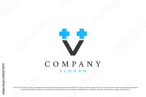 Obraz premium letter v with double plus hospital symbol modern minimalist logo