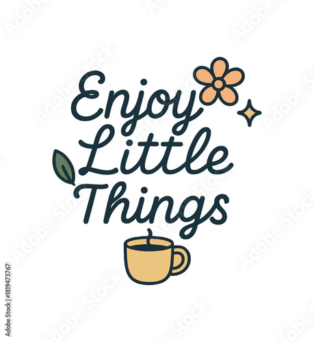 © Lion, Obraz premium Lettering composition Enjoy Little Things with mug flower leaf and sparkle flat vector simple outline minimal centered layout isolated background no extra captions