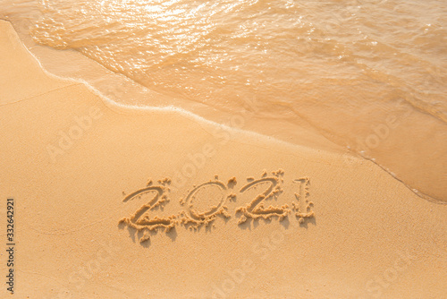 © wuttichok, Fototapeta premium lettering on the beach with wave. Numbers 2021 year on the sea shore, message handwritten in the golden sand on a beautiful beach background. Happy new years 2021 concept.