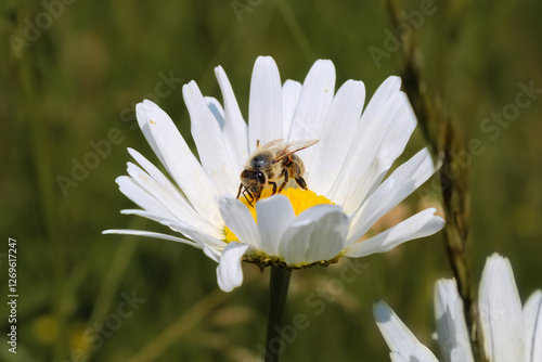 © Melanie, Obraz premium Leucanthemum vulgare Einzelne Margeritenblüte mit Biene