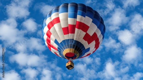 Naklejka premium Leuchtend rot und blau gestreifter Heißluftballon in einem klaren blauen...