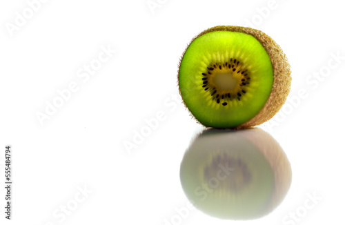 © hannesheigl, Obraz premium Leuchtende frische, grüne Kiwi auf weißem Hintergrund mit Spiegelung.