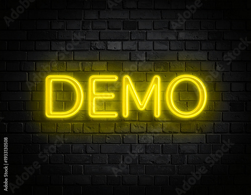 Obraz premium Leuchtende gelbe Neonschrift "Demo" auf dunkler Backsteinmauer