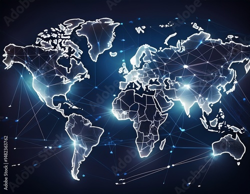 Fototapeta premium Leuchtende Weltkarte mit weißen Vernetzungslinien auf dunklem Hintergrund