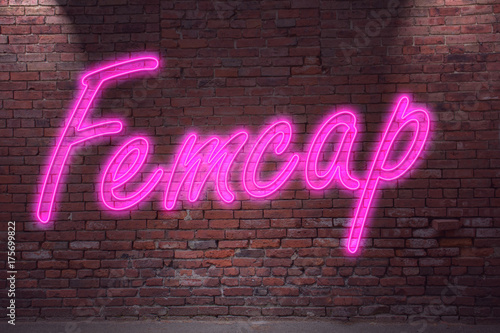 Obraz premium Leuchtreklame Femcap an Ziegelsteinmauer