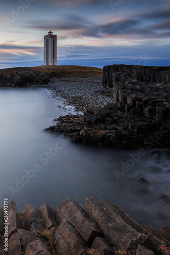 © Gunar, Fototapeta premium Leuchtturm im letzten Abendlicht. Im Vordergrund Basaltgestein. Im Norden Islands