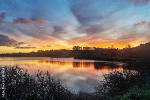 Fototapeta premium Lever de soleil aux teintes orangées se reflétant sur l'étang de l'Aber, presqu'île de Crozon. Quelques nuages se dessinent dans le ciel et se mirent dans l'eau paisible.
