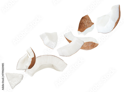 Fototapeta premium Levitating coconut pieces isolated on white background. High Quality Flying...