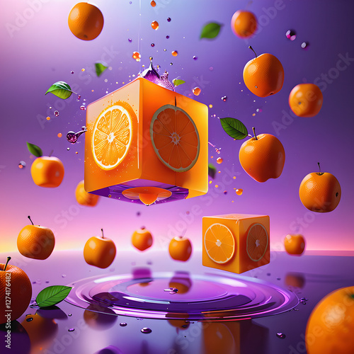 © jirawat, Obraz premium Levitating Fruit Cube: Futuristic Ephemeral Delight