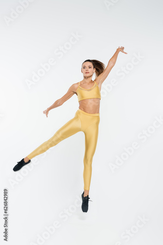 Obraz premium levitation, aerobics, sportswoman in active wear jumping on white background,...
