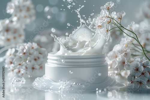 © Anna, Fototapeta premium Levitation moisturizing cream in bottle on white background, 3D render. Creative illustration with splashes of cream, mock up
