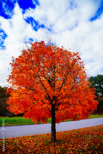 Fototapeta premium Lexington, Massachusetts, USA: 10 25 2025: The fall foliage red leaf...