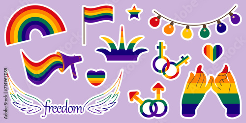 © Tetiana Komarytska, Naklejka premium LGBT sticker pack on blue background. LGBTQ set. Symbol of the LGBT pride community. Rainbow elements.