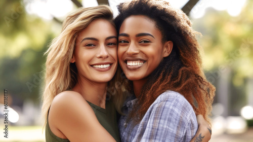 Obraz premium LGBTQ+ community Sunlit moment captures young, diverse gay women, tenderly embracing. Love radiates, intertwining their souls, a heartfelt portrait etched in time. Generative AI