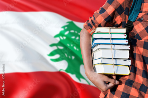 © sezerozger, Obraz premium Liban koncepcja edukacji narodowej. Zbliżenie nastoletnich studentów trzymając książki pod pachą z tłem flagi kraju.