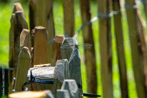 © Patrick, Obraz premium Libelle auf einem Holzzaun