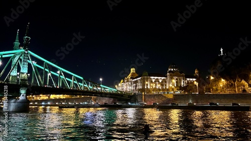 Obraz premium liberty bridge and illuminated buildings by the Danube River at night, Budapest