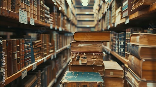 Fototapeta premium Library Bookshelf Aisle with Stacked Books
