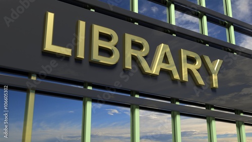 Obraz premium Library building sign closeup, with sky reflecting in the glass.
