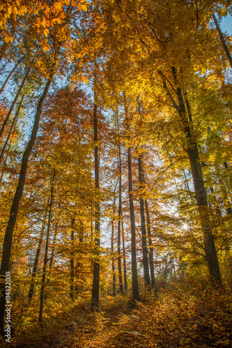 Fototapeta premium Lichtspiel in herbstliche verfärbtem Laubwald mit blauem Himmel