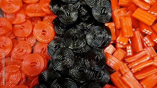 © anela47, Fototapeta premium Licorice rolls, shiny, red and black. Background, Texture, Close-up,