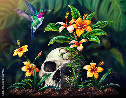 Fototapeta premium Life blooming from death. A skull amidst vibrant hibiscus flowers in the jungle, symbolizing rebirth, resilience, and the cycle of nature with a hummingbird.