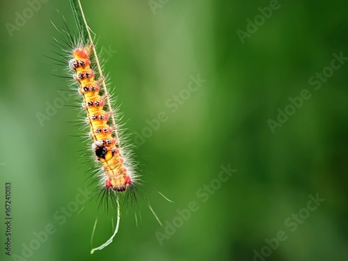 © Nyutikno, Naklejka premium Life Cycle: Who Inhabits Wild Leaves? A Close-Up of a Butterfly Larva (Orgyia thyellina)