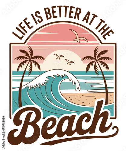 Naklejka premium Life is Better at the Beach Illustration with Palm Trees, Waves, and Seagulls Keywords: life is better at the beach, ocean, sea, waves, palm trees, seagulls, sun, sand, tropical, vacation, travel