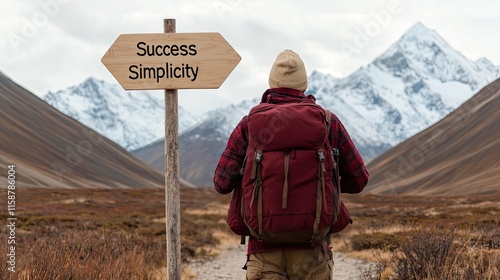 © CassiOpeiaZz, Naklejka premium Life Priorities concept. A traveler stands before a signpost with "Success" and "Simplicity" in a mountainous landscape, contemplating their journey.