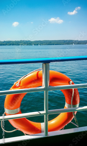 © diamant24, Fototapeta premium Lifebuoy on board ship at blue sky