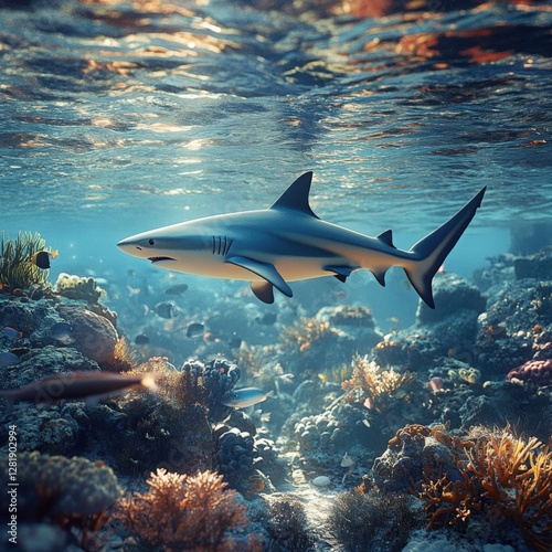 Fototapeta premium Lifelike digital illustration of a shark swimming in a vibrant coral reef.