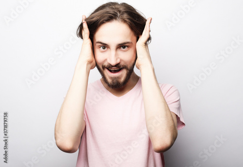 © Raisa Kanareva, Naklejka premium lifestyle and people concept:young man has excited expression, dresssed casually