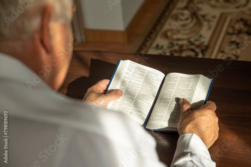 © TSViPhoto, Obraz premium Lifestyle portrait of senior man reading Holy Bible at home. Natural aesthetic light