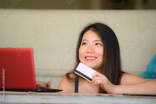 Fototapeta premium lifestyle portrait of young beautiful and happy Asian Korean woman holding credit card banking and online shopping with laptop computer at home couch in internet business