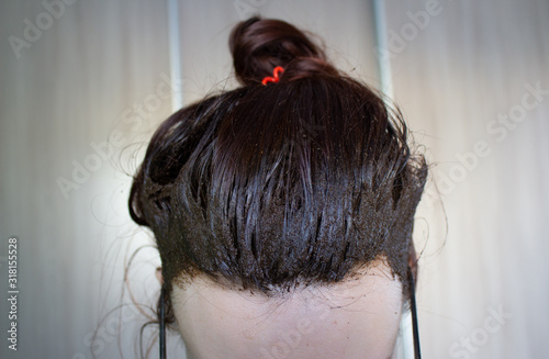 © Anat art, Naklejka premium lifestyle woman paints henna gray hair, hair coloring self-care
