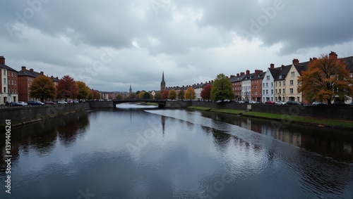 © Julia, Naklejka premium Liffey Views in Ireland Dublin shows calm river with bridge, red-roofed houses, trees in autumn colors. Concept of Liffey Views in Ireland Dublin reflects serene landscape.