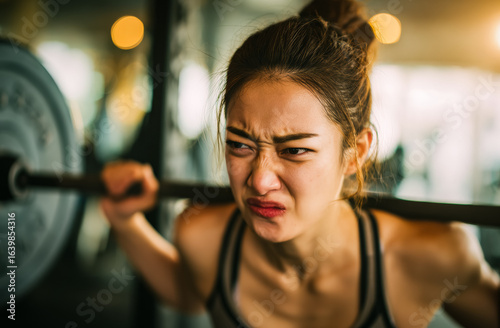 © Surachetsh, Obraz premium Lifting heavy barbell weights with focus and effort, a woman expression shows the determination and exertion required to build physical strength.